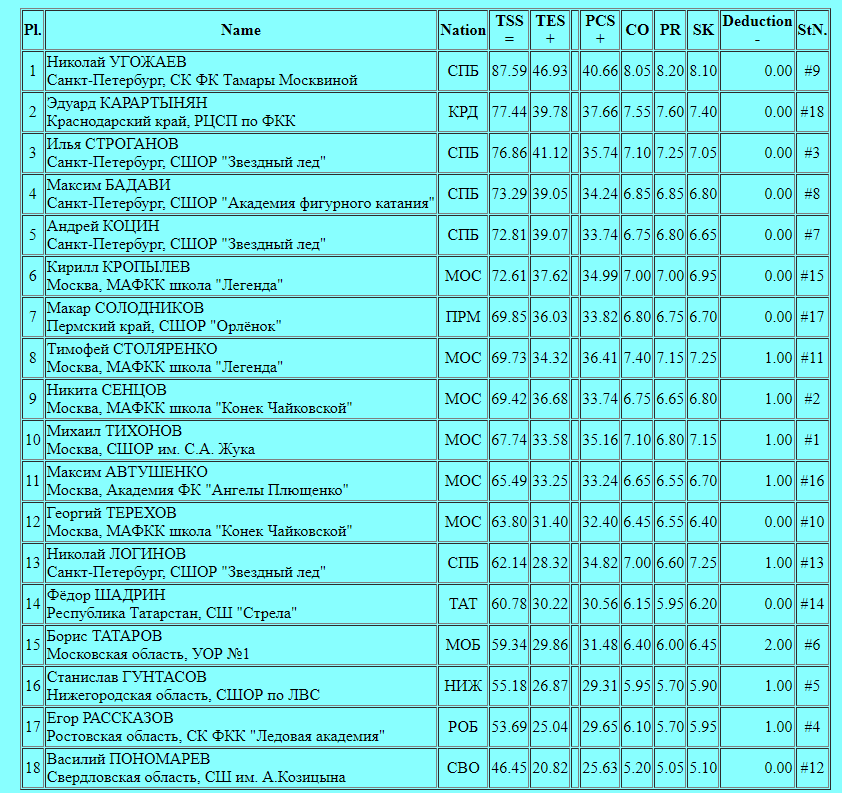 - ❎1 место. Николай Угожаев (17 лет, Клуб фигурного катания Т.Москвиной, тренеры - Вероника Дайнеко, Александра Панфилова, Дмитрий Хромин)