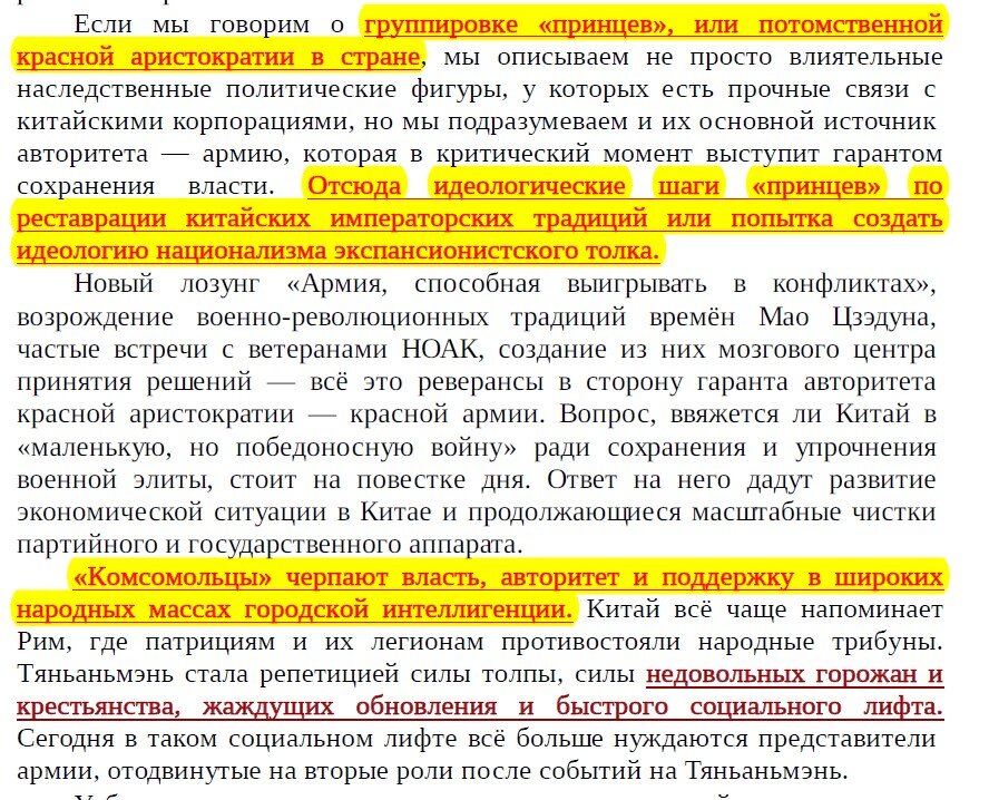 В Китае правит не КПК, а два элитных клана - "комсомольцы" - возводившие народ на площадь Тяньаньмэнь, и противостоящий им клан наследственной военной аристократии - красных "принцев". "Если красная аристократия опирается на закрытую касту избранных— китайскую армию и касту кадровых работников государственных корпораций, то «комсомольцы» опираются на огромные массы деревенских жителей и около 200 млн мигрантов, а также на наиболее активную университетскую молодёжь. Влияние «комсомольцев» в армии очень ограниченно." При этом "возврат с 2000-х годов на ведущие позиции во власти представителей либерального крыла политической элиты Китая, активно поддерживаемой Демократической партией США." "Сегодня за красной военной аристократией — армия и партийный аппарат, а за «комсомольцами» — влияние на широкие народные массы, впрочем исчезающее под воздействием экономического кризиса, и полный контроль над экономическим блоком в правительстве, а также поддержка глав целого ряда регионов Китая." По