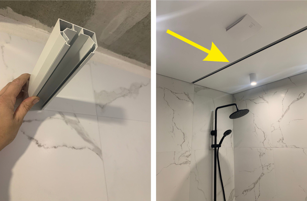 А для того, чтобы интерьер Вашей ванной комнаты был более современным, вместо привычной всем штанги, Вы можете установить встроенный профиль на потолке, средняя стоимость которого составляет 3000 рублей.