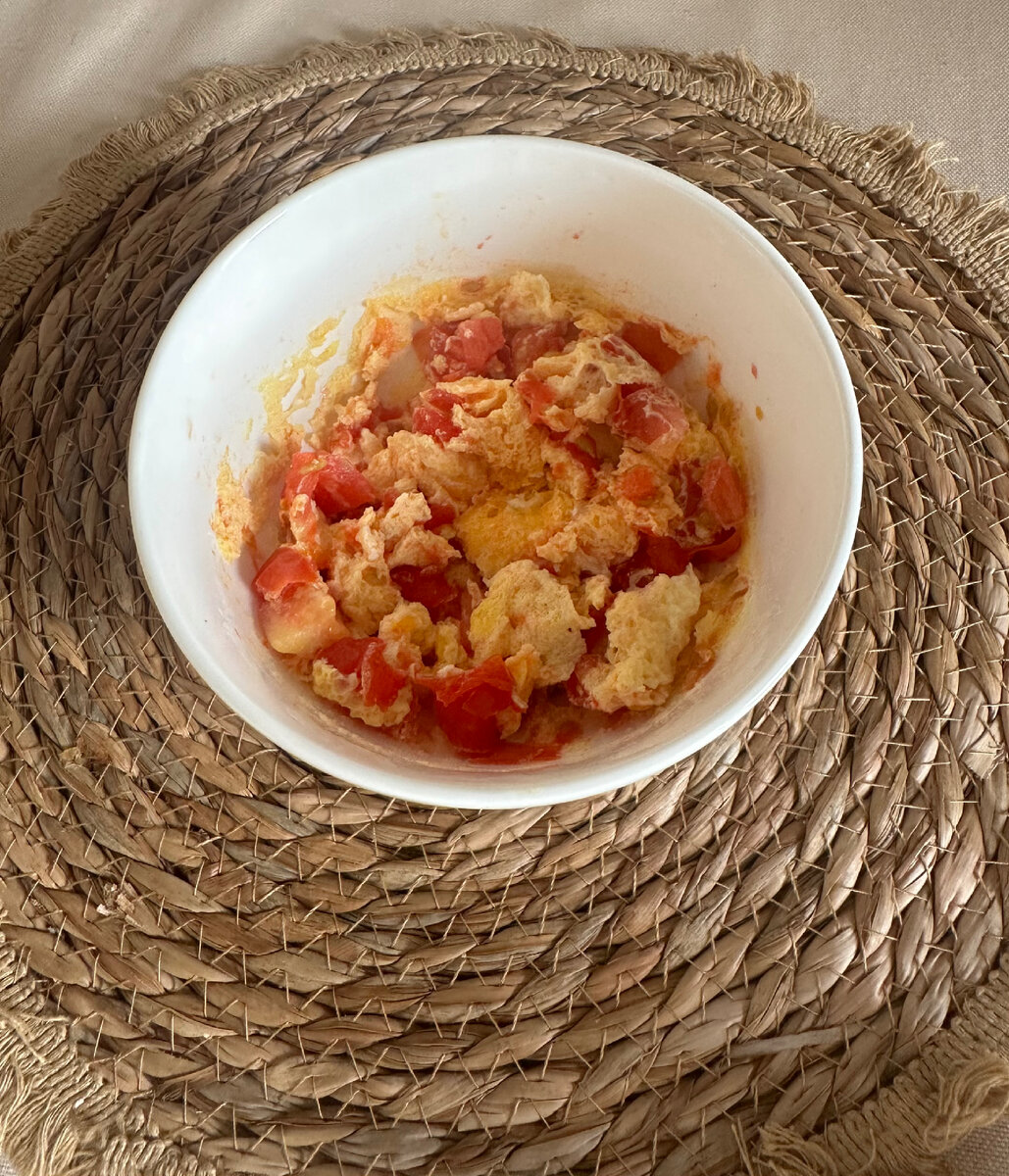 - В тарелку перекладываем помидор, разбиваем яйцо, солим и перемешиваем