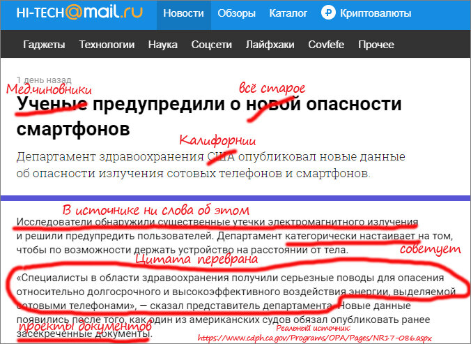 Далее начинаются чудеса с цитатой. В англоязычной новости она выглядит вполне пристойно: «Несмотря на то, что наука всё ещё развивается, среди некоторых специалистов в области общественного здоровья и представителей общественности есть опасения относительно долгосрочного и высокоэффективного воздействия энергии, выделяемой сотовыми телефонами», — сказала директор CDPH д-р Карен Смит. Проверяем по сайту CDPH — действительно, сказала именно так. Получается, что «серьёзные поводы для опасения» новостник mail.ru придумал? Получается. Ну и плюс он как-то так незаметно замёл под ковёр «некоторых специалистов» и «представителей общественности». В результате получилось, что не единичные фрики носятся с «фонящими» сотовыми, а прям нормальные такие исследователи, пачками.