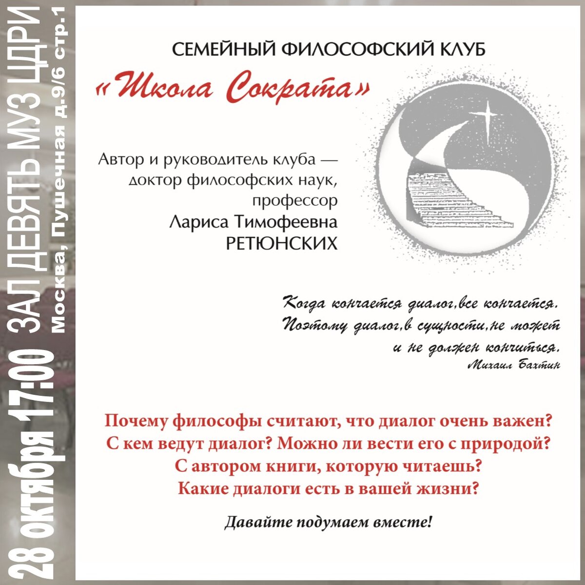 Какие диалоги есть в вашей жизни? Давайте подумаем вместе! Автор и руководитель клуба — доктор философских наук, профессор Лариса Тимофеевна РЕТЮНСКИХ 28 октября, суббота 17:00