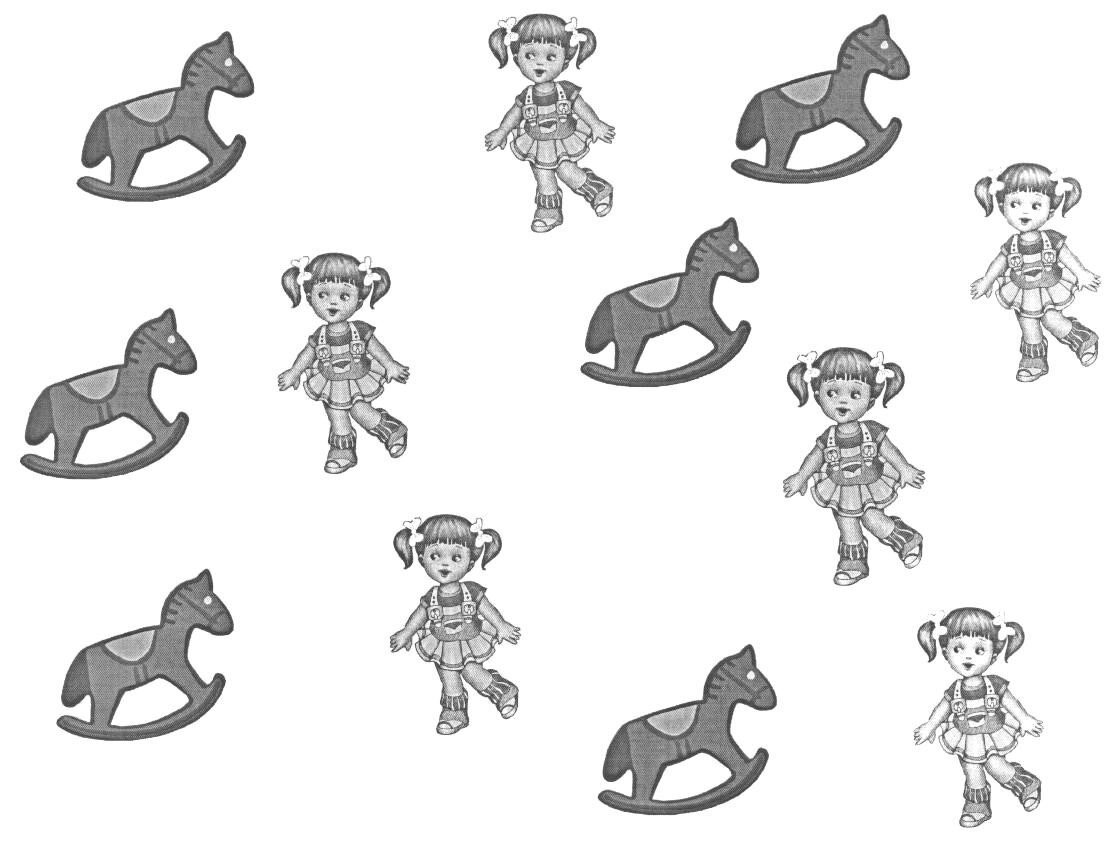 - По сколько лошадок и кукол? Сосчитайте.