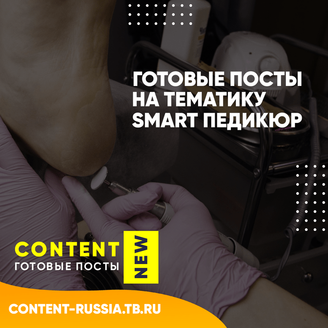 Привет! Ты мастер SMART ПЕДИКЮРА который в поиске постов и сторис? мы подготовили для тебя 50 тем постов для раскрутки ваших страниц в социальных сетях. Также вы сможете найти готовые посты и сторис для мастера SMART ПЕДИКЮРА на нашем сайте: WWW.CONTENT-RUSSIA.TB.RU !ВНИМАНИЕ! СПИСОК ТЕМ НЕ ПОЛНЫЙ, ТАК КАК ПОСТЫ И СТОРИС ПОПОЛНЯЮТСЯ КАЖДЫЙ МЕСЯЦ - купить посты и сторис можете на сайте CONTENT-RUSSIA.TB.RU 50 ТЕМ ПОСТОВ НА ТЕМУ SMART ПЕДИКЮР 1. SMART педикюр — это педикюр, который подходит абсолютно любому здоровому человеку.