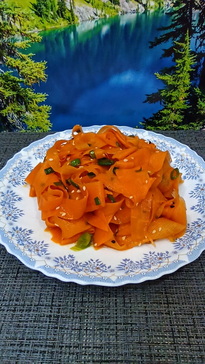 Это просто бомбический салат из обычной моркови, которая доступна нам круглый год. Что только из нее не делаю и куда только не используют в кулинарии, ну ни как без нее не обойтись. Поделюсь с вами простым в приготовлении салатом, в котором только полезные ингредиенты. А подача какая... Кучерявая... Способ приготовления: 1. Морковь моем и очищаем от кожуры. Теперь специальным ножом для очистки овощей нужно от кончика моркови до ее низа провести этим ножом, как бы снимая слой, чтобы у нас получилась тонкая полоска (слайс.) Так нам нужно нарезать целую тарелку 200-250 грамм. 2. В наши морковные кудри добавляем семена кунжута 2 чайные ложки. 2. Соевый соус 2 столовые ложки. 3. Оливковое или кунжутное масло 2 столовые ложки. 4. Мед 1 чайная ложка. 5. Так же добавляем 1 столовую ложку яблочного уксуса, 3 столовой ложки сока лимона или 1/2 половинки лайма, по вкусу нарезанный зелёный лук, щепотку соли и все хорошо перемешиваем. Теперь даём салату настояться 15 минут и можно подавать на сто