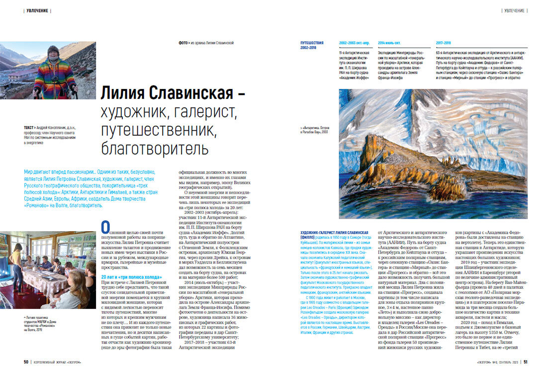 В корпоративном журнале ПАО «Газпром» размещена статья об участнике Ассоциации частных и народных музеев России – Доме художника Лилии Славинской. Предлагаем ознакомиться со статьей. «Мир двигают вперед пассионарии… Одним из таких, безусловно, является Лилия Петровна Славинская, художник, галерист, член Русского географического общества, покорительница «трех полюсов холода»: Арктики, Антарктики и Гималаев, а также стран Средней Азии, Европы, Африки, создатель Дома творчества «Романово» на Волге, благотворитель…» ГАЗПРОМ. КОРПОРАТИВНЫЙ ЖУРНАЛ ПАО «ГАЗПРОМ» No–9 2023