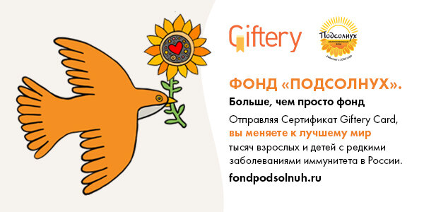Компания Giftery продолжает свою благотворительную деятельность. В этот раз мы поддержим подопечных Благотворительного Фонда «ПОДСОЛНУХ» - людей, с врожденными нарушениями иммунитета. Как помочь? Всё просто! C 13 по 26 октября включительно с каждой отправленной вами подарочной карты Giftery Card компания Giftery будет перечислять 10% от прибыли в помощь детям и взрослым с тяжелыми врожденными нарушениями иммунитета, подопечным Благотворительного Фонда «ПОДСОЛНУХ». Что такое Giftery Card? Giftery Card – универсальная подарочная карта, которую с помощью пары кликов на сайте Giftery можно отправить прямо по email или sms получателю. Обладатель сможет обменять ее на подарочные сертификаты известных брендов из каталога Giftery. О фонде: