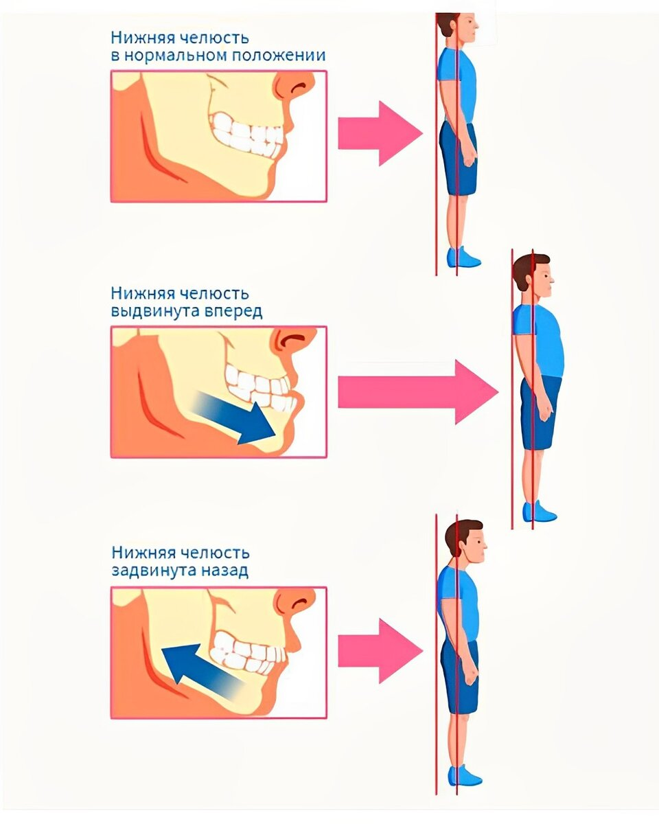 А между тем доказано, что неправильная осанка приводит к проблемам с суставами и к нарушениям в прикусе. Действует и обратная связь: прикус оказывает влияние на осанку.