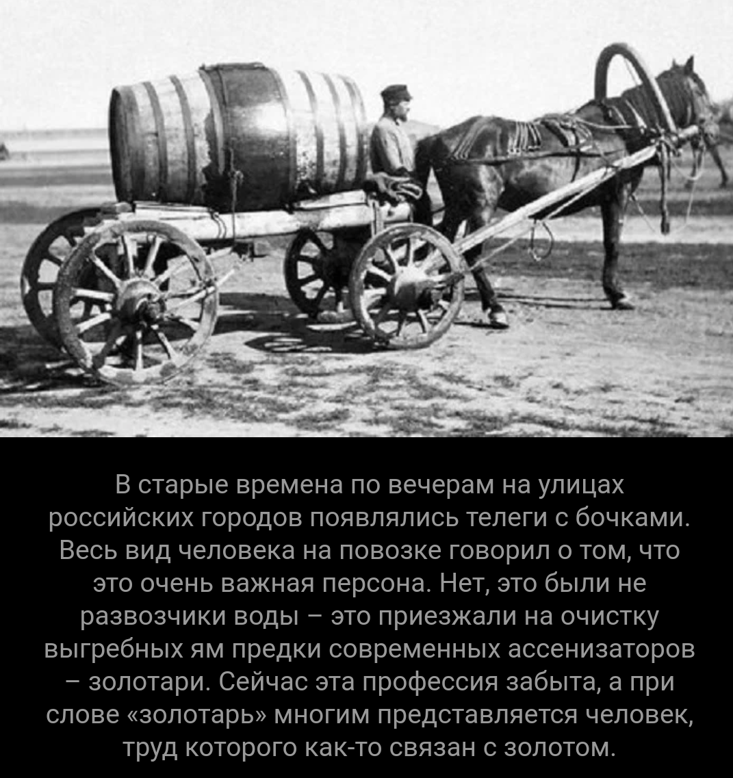 До века XIX золотарями называли тех кто работал с золотом, то есть и ювелиров и золотодобытчиков-старателей. Когда стали появляться в Российских городах туалеты с выгребными ямами появилась и профессия дерьмовщика - очень нужная и даже денежная профессия. И вот в XIX нашелся шутник подметивший что старатели и дерьмовщики имеют в своей работе комичную схожесть, только одни черпают ведрами воду и песок что бы намыть золота и заработать денег, а другие тоже черпают ведрами, но уже фекалии чтобы заработать, как и старатели, неплохие деньги. И с тех пор иронично дерьмовщиков стали именовать золотарями, со временем ирония улетучилась и золотарями ассенизаторов стали звать на полном серьёзе.