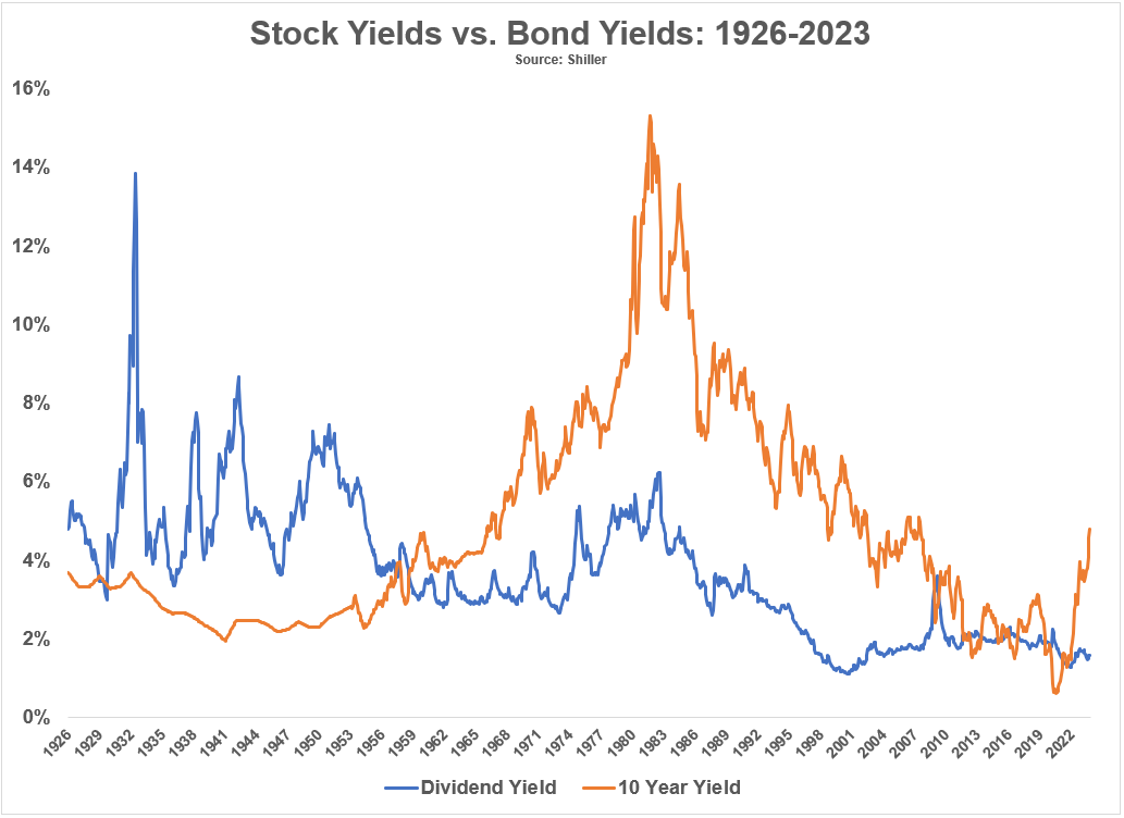 Но даже этой дивидендной доходности ниже средней было достаточно, чтобы составить некоторую конкуренцию доходности облигаций в последние годы. Теперь уже нет. Вот историческая дивидендная доходность S&P 500 по сравнению с доходностью 10-летних казначейских облигаций начиная с 1926 г.: