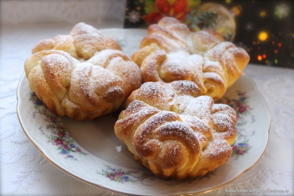 Ингредиенты: 350гр. муки., 80гр. мягкого сливочного масла., 2 яичных желтка., 140гр. тёплого молока., 3ст.л. сахара., 1 пакетик ванильного сахара., 10гр. дрожжей., немного сладкого молока для смазывания булочек., сахарная пудра. Приготовление: В миску налить молока. Добавить 1ч.л. сахара. Всыпать дрожжи, перемешать, накрыть салфеткой и оставить на 10 минут. В отдельной посуде смешать муку, сахар и соль. Добавить подготовленную опару+молоко+сахар и яйцо. Смешайте ложкой. Когда тесто станет трудно размешать, добавить рубленное на мелкие кусочки масло. Вымешать тесто в течение 10 минут. Переложить тесто в чистую миску, накрыть салфеткой и оставить в тёплом месте около 1 часа 30 минут, пока тесто не поднимется (увеличится в 2 раза). Разделить тесто на две части. Раскатать не слишком тонко. Вырезать кружочки (здесь 5см. в диаметре). Сложить три круга из теста. Свернуть их вместе, а затем разрезать напополам и получится 2 части кружев. Это проделать со всем тестом. Выстелить форму для кексо