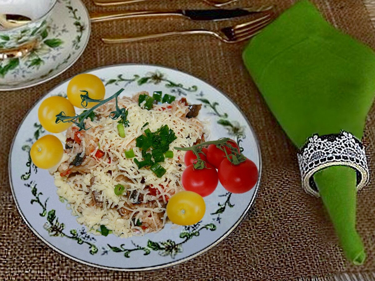Рецепт для небольшой мультиварки объёмом 3 л Panasonic-10. Продукты Рис - 1 мультстакан Грибы любые - 200 г Помидоры - 2 шт. Сыр - 150 г (100 г в плов + 50 г на посыпку) Вода - 2 мультсакана Соль - 1 ч. л. Растительное масло Зелень Приготовление 1. Налить растительное масло в чашу мультиварки. Установить программу «Выпечка» («Жарка» - в других мультиварках). 2. Нарезать грибы и положить в чашу. Обжарить. 3. Добавить рис и немного потушить с грибами (3 – 5 минут). Программу выключить. 4. Положить мелко нарезанные помидоры. 5. Залить всё подсоленной водой. 6. Установить программу «Плов». В других мультиварках эта же программа, время 35 – 40 минут. 7. После сигнала плов посыпать тёртым сыром. Перемешать. 8. При подаче сверху посыпать оставшимся сыром и зеленью. Другие рецепты плова: