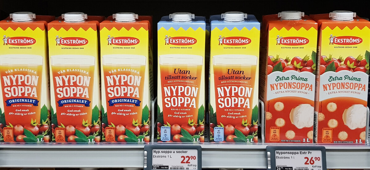 Каждый раз, когда я приезжаю в Швецию (а она здесь рядом, только через мост переехать), я покупаю себе шведский суп! Почему-то у нас в Дании его не продают, хотя, казалось бы, соседи, могли бы и едой меняться. В Швеции же он на выбор, мой любимый суп из шиповника: Казалось бы, с чего это мне любить это нетипичное для России блюдо? Все очень просто - этот суп очень напоминает кисель! Тот самый советский кисель! И его можно пить как кисель, но шведы едят его как сладкий суп, заправляя сметаной, мороженным или сухим миндальным печеньем, которое можно купить тут же. Еще я люблю суп из черники, он тоже вкусный: Выбор большой, можно выбирать: Еще в Швеции, да и в Дании тоже, продают кисель погуще, пить который нельзя, поэтому едят его ложкой, кто со сметаной, кто с йогуртом. Делают его из яблок, ежевики, груш. И, конечно, клубники, А вам нравится кисель?