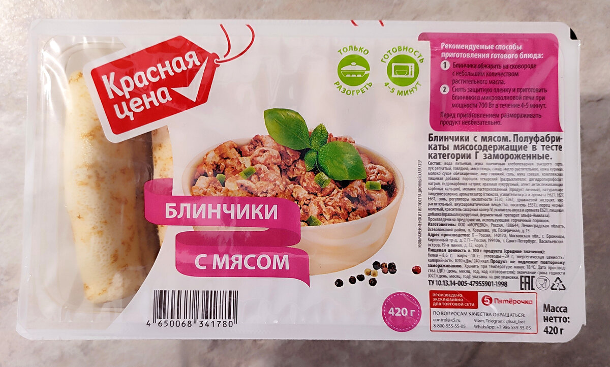 Всем привет! Сегодня решил попробовать блины с мясом бренда "Красная цена" из Пятерочки. На вид блины как блины, самое интересное что по вкусу. Цена 79,99 р. Что-то это уже не "красная" цена. По акции за такую цену можно найти блины более именитых брендов. Масса 420 грамм. Блины изготовлены ООО "Морозко" в г. Бронницы. Вообще вроде как Морозко делает нормальные продукты. Для такого простого блюда в составе достаточно много усилителей вкуса и Е-добавок. Есть такая закономерность: чем дешевле стоит продукт, тем длиннее у него состав. В состав начинки входят лук репчатый, говядина, мясо птицы, кожа куриная, жир говяжий. Не самый лучший набор). И сразу понятно, что тут берут все отходы производства, перемалывают в фарш, хорошо сдабривают глутаматом и начинка готова. Блины надо хранить замороженными. Повторной заморозке не подлежат. Интересно почему?) Жарим на сковороде на небольшом количестве масла, чтобы было вкуснее). Если не следить за блинами, то они могут очень хорошо по