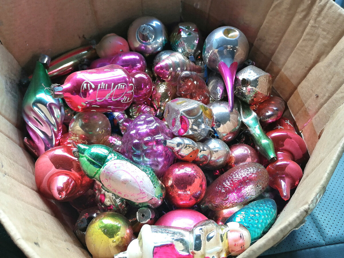 Старые новогодние игрушки на ёлку, половина большой коробки.