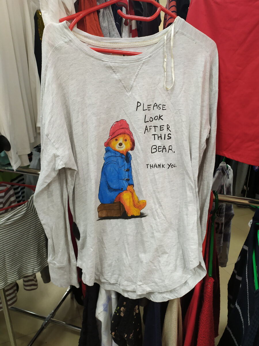 Продолжаем путешествие в страну невыученных уроков некупленных товаров в секонд-хенде. Здравствуйте, дорогие друзья! Верх от пижамы или лонгслив? Не знаю, как назвать правильнее, но привлек внимание принт. Милейший медвежонок в дафлкоте и шляпке. И надпись: "Пожалуйста, присмотрите за этим медведем. Спасибо". Кардиган от Zara. Цвет очень красивый, пуговицы из перламутра, состав — большая часть вискоза. А тактильно — плотная резина. Нет, не надо такого даже даром. Хлопковый свитер от бренда "Тайфун" (ничего, что я по-русски?). Самый что ни на есть классический. Изъянов — ранений от моли, зацепок и т.п. нет. Жилет от именитого бренда Karen Millen. Интересно выполнены петли, лацканы карманов, имитация ручного шва, брендированно всё, что можно. Талия регулируется на спине. Всё, как положено в подобных предметах гардероба. И состав неплохой: шерсть, вискоза, капля эластана, подкладка — ацетатный шёлк. И судя по пакету с запасной пуговицей — новый жилет. Но остался в магазине.