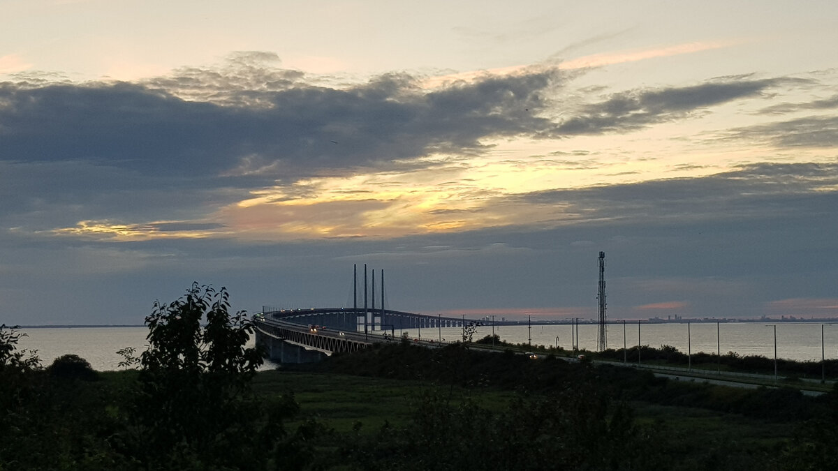 Данию и Швецию разделяет пролив Эресунн, а соединяет мост с одноименным названием. Вот он на закате, уходит из Швеции в Данию: