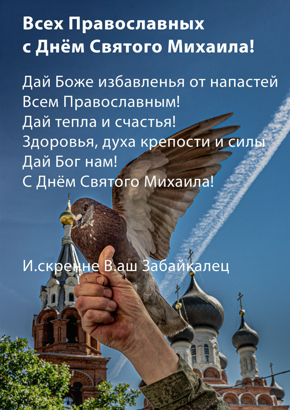 СМС-поздравление. * Дай Боже избавленья от напастей Всем Православным! Дай тепла и счастья! Здоровья, духа крепости и силы Дай Бог нам! С Днём Святого Михаила! * И.скренне В.аш Забайкалец. 21.11.23 СМС-поздравление. * Желаю рыбакам улова! Бездомным - обретенья крова! Болящим дай Бог исцеленье! А страждущим дай утешенье! Всех, кто под знаменем Христовым, Со Светлым Праздником! С Покровом! 13 10.19 *** Молись, люд Православный, в трудный час О наших Воинах, Донбассе, Крыме! Замолвит слово Господу Za нас Наш Преподобный Отче Серафиме! 1.08.23