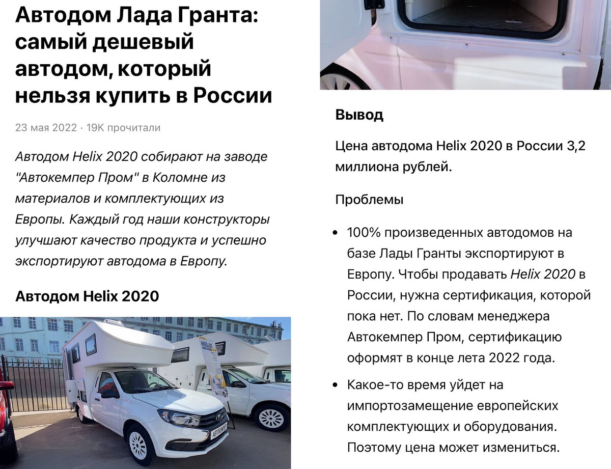 Сегодня попалась статья вполне уважаемого канала по теме, в которой обсуждались российские кемперы на базе Гранты, которые нельзя купить в России. Я собрался было написать комментарий, что можно, но потом увидел дату публикации. В общем, все смешалось в доме Облонских: Дзен в своем репертуаре кинул в массы пост времен динозавров, а прочитавшие его и не обратившие внимание на дату так и будут уверены, что воз и ныне там. Что не так в этой формуле? *** *** Начнем с того, что сейчас этот автодом можно купить и официально в России зарегистрировать. Из партии, предназначенной на экспорт остались два дома. Цена меньше, чем в статье 3 090 000 рублей. Ее обсуждать не буду, потому надо понимать, что модуль не из дешевой фанеры из Леруа, и не в гараже все строилось, а серийно на заводе. У нас же принято сравнивать с дядей Васей, который в гараже сварил и склеил, и получилось дешево и сердито. Не об этом речь... Речь о том, что Дзен кичится своими крутыми алгоритмами, научившимися даже роботов об