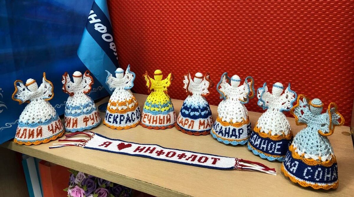 5 лет назад круизной компании «Инфофлот» исполнилось 5 лет и у них был организован конкурс поздравлений. Я тогда связала 8 ангелочков с названиями теплоходов, получила 2 приз. Эти 8 ангелочков были в офисе «Инфофлота» в Нижнем Новгороде, а вторые экземпляры – на теплоходах. Не знаю уж судьбу этих ангелочков, но на «Лунной сонате» у директора круиза Аделины до сих пор живет ангелочек с нашего любимого теплохода «Александр Бенуа», а теперь появился и новый ангелочек с бисерной надписью «Лунная соната». Вязание начинаем с головки.