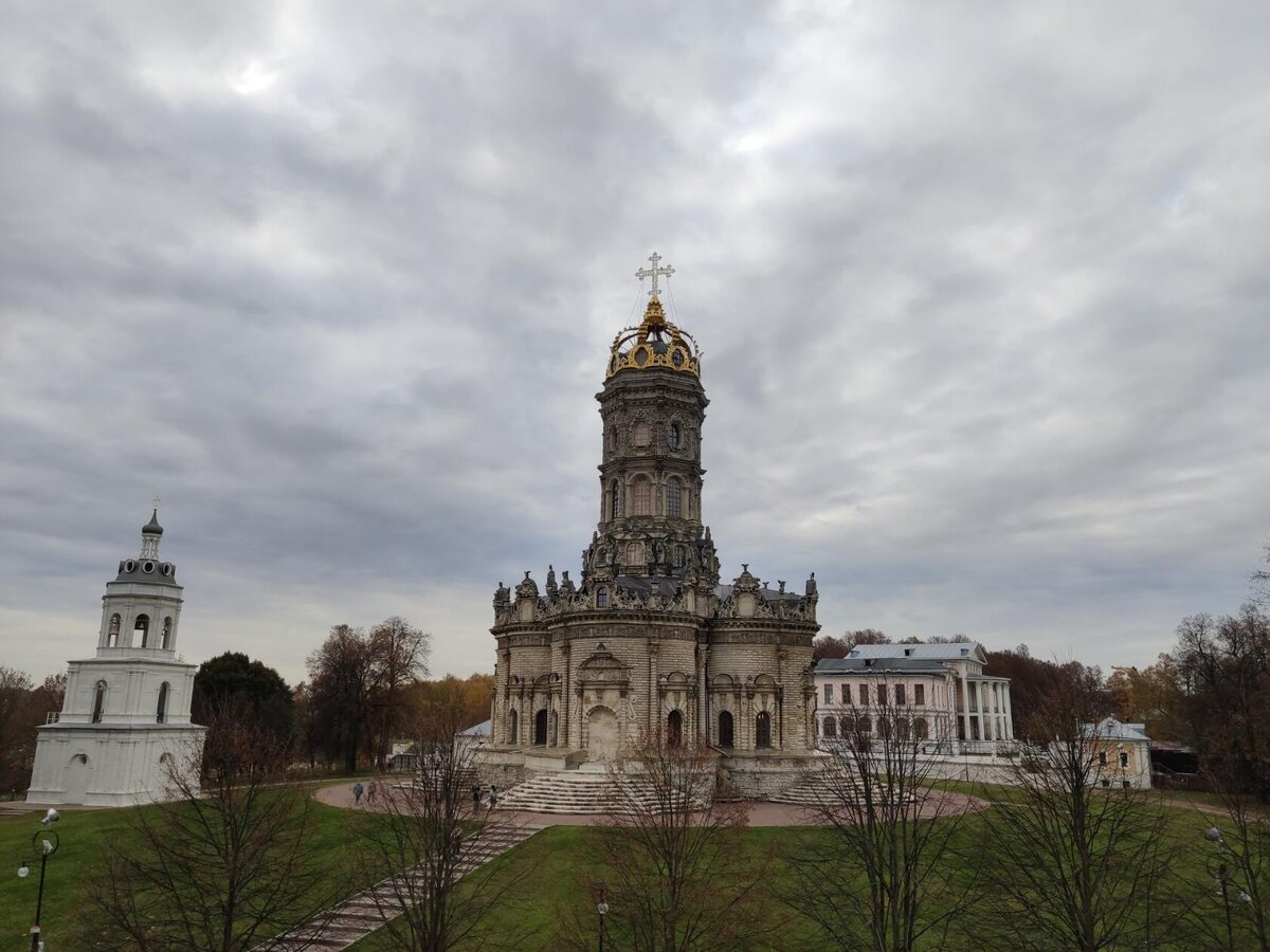 Дубровицы потрясают, как бы банально это не звучало. Ведь здесь расположена невероятная по своей красоте и мощи церковь Знамения Пресвятой Богородицы. Хотя основной целью нашей осенней поездки была усадьба в Суханово, мы решили заехать и в Дубровицы, чтобы полюбоваться этим храмом в стиле зрелого барокко. Усадьба Дубровицы в Подольском районе Московской области не является туристическим объектом, но посетителей здесь много даже в такую непостоянную по погоде октябрьскую пору. Можно сказать, что это усадьба, в которой есть всё, кроме собственно усадьбы. Точнее, дворцовый комплекс есть, но попасть внутрь не получится. В нём соседствуют НИИ животноводства и ЗАГС. Да и от декоративного парка сохранился только участок липовой рощи. Такие вот превратности судьбы. Так что погладим одного из львов и пойдём дальше. Церковь Знамения Пресвятой Богородицы конца XVII– начала XVIII веков - это действующий с 1990 года храм. Для церковной архитектуры России она уникальна. Вместо купола её венчает ажур