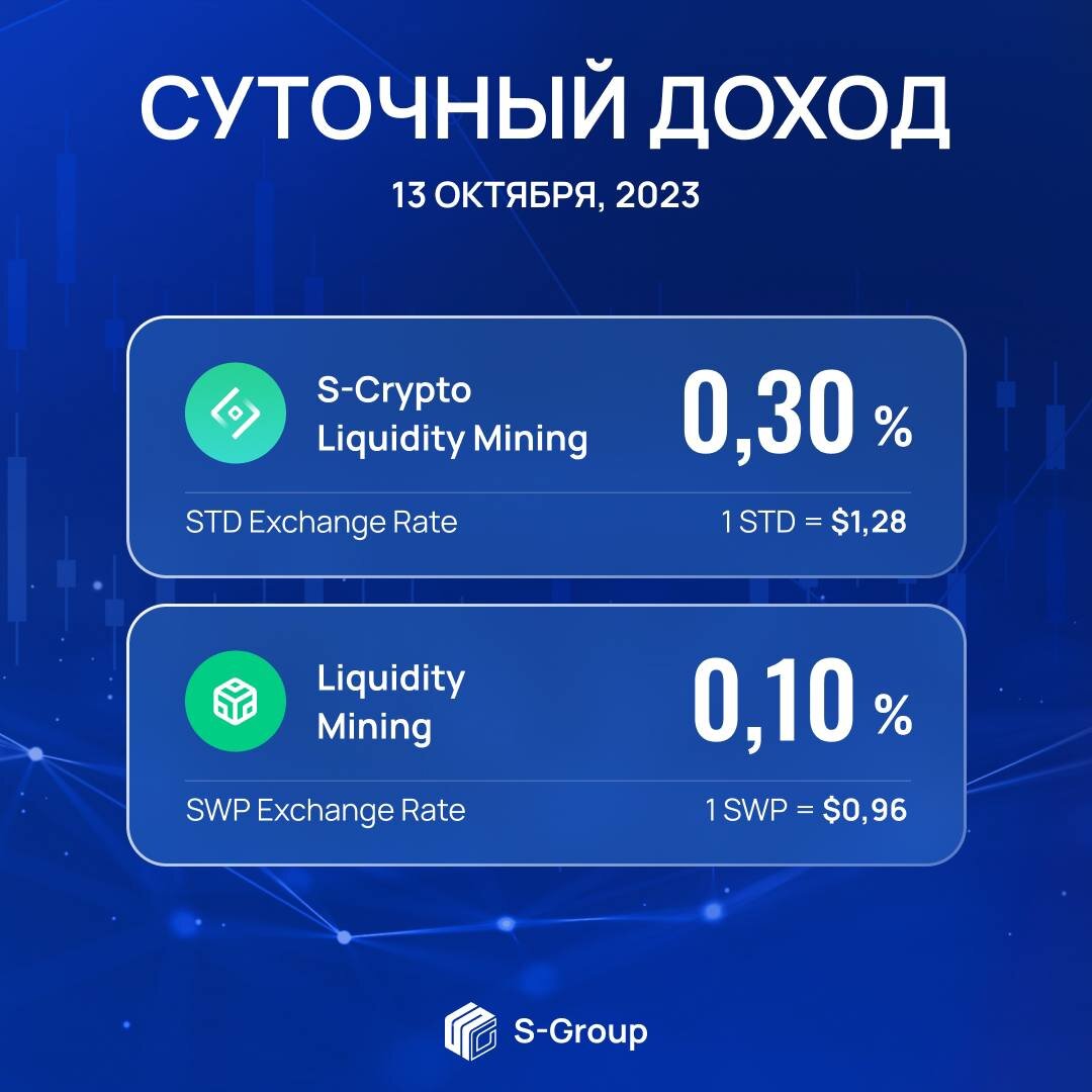 Cуточный доход S-Group за 13 Октября 💸 🔹 Прибыль в направлении S-Crypto Liquidity Mining составила +0.30% 🔹 Прибыль в направлении Liquidity Mining SWP составила +0.10%