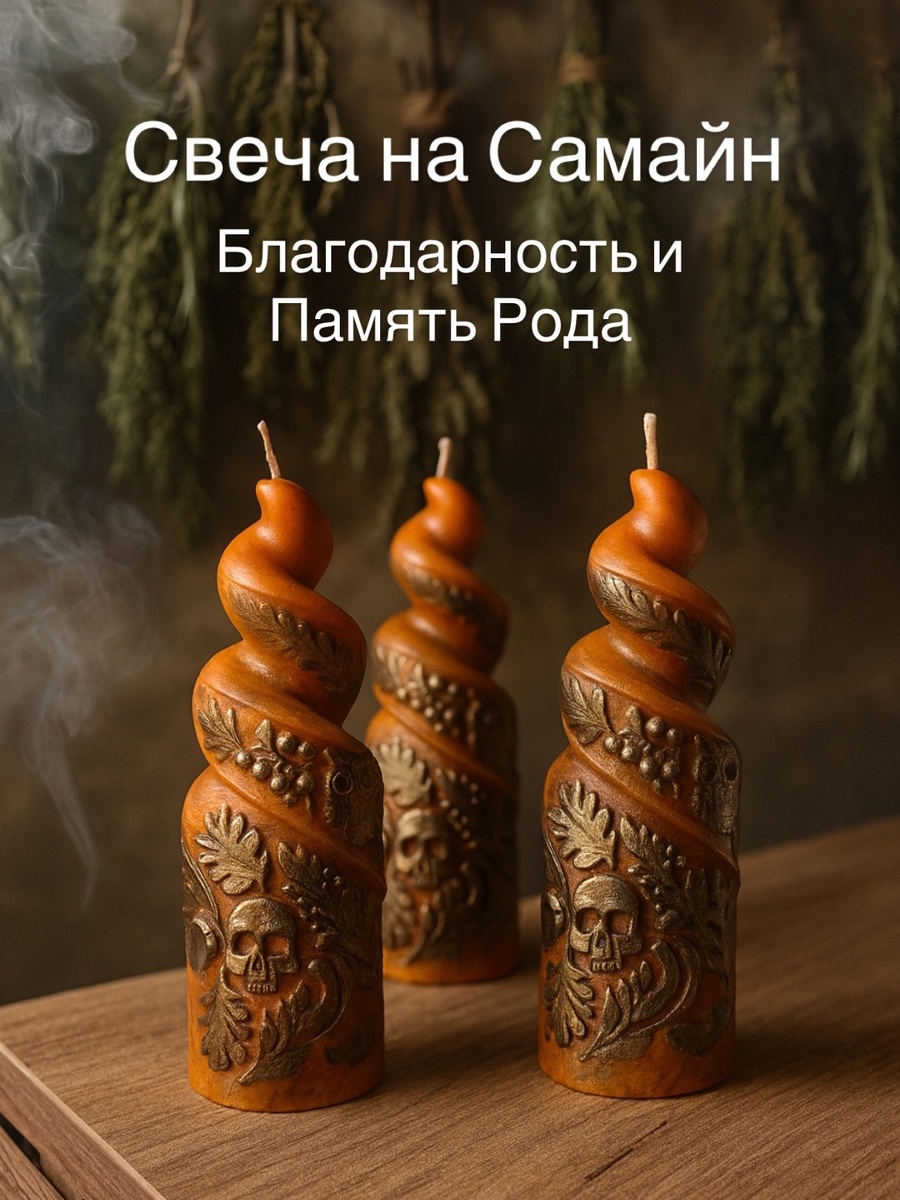 Самайн - тайная ночь почитания предков, время, когда наши воспоминания о них и благодарность им наиболее сильна. Цвета праздника, черный и оранжевый, символизируют окончание и начало жизненного цикла. Празднуется с 28 октября по 3 ноября. Самая сильная ночь с 31 на 1ое число. Вы также имеете возможность использовать свечи Самайна в другие дни. Самое главное - соблюдать определенные действия. Чтобы провести этот ритуал: Важно помнить, что этот ритуал должен осуществляться с искренними намерениями и чувствами благодарности и душевности. Это время для общения с нашим родом и помощи тем, кто нуждается. Желаю вам гармонии и благополучия во время проведения этой практики. !!!!Меры предосторожности!!!! 1. Не размещайте свечу рядом с сухоцветами или бумагой. 2. Необходимо установить свечу на огнеупорную поверхность и защитить ее от протечек воска, например, использовав фольгу. 3. Возможно возникновение небольших искр из-за сухих трав, если есть в составе. 4. Присутствие трав може