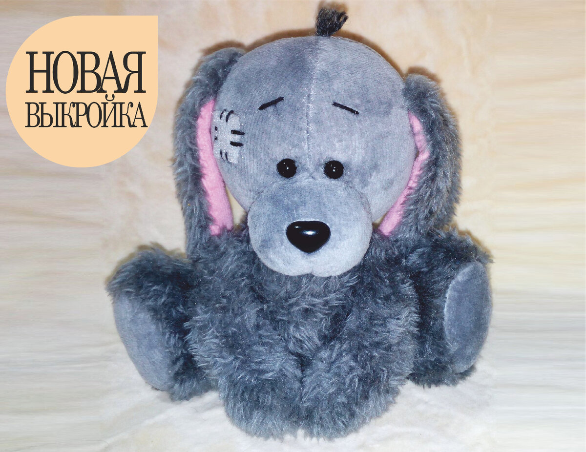 Татьяна Браженкова Для работы вам понадобятся материалы: толстые черные нитки и крепкая сапожная нить. Раскроите детали: Из серого меха: туловище, верхние и нижние лапы, внешние уши и хвост. Из серого велюра: голову, мордочку и ступни. Из розового велюра: внутренние уши. Из серого фетра: заплатку. Сшейте уши, верхние лапы и хвост. Соедините детали живота и спинки между собой, затем сшейте туловище. Все выверните. Сшейте нижние лапы. Не обращайте внимания на сшитую голову на предыдущем фото. Так как выкройка была тестовая, голова при набивке не получила желаемую форму. А голову шьем так: соедините передние детали головы, затем задние. Потом затылок и перед головы между собой. Деталь мордочки соберите на нить по периметру и слегка стяните. Затем зашейте вытачку спереди по середине мордочки от носа к основанию. И пришейте эту заготовку к отверстию в передней части головы. Голову выверните. Теперь притачайте ступни к ногам. Ноги выверните. На ушах зашейте отверстия для выворачивания