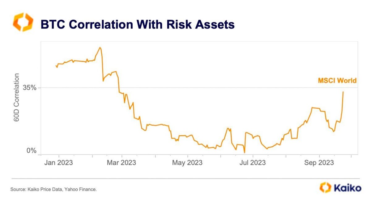 ☄️#BTC. Про риск 60-дневная корреляция BTC с рисковыми активами растет, но она намного ниже среднего показателя 2022 года, составляющего более 50%. Фактически, BTC продемонстрировал устойчивость к растущим затратам по займам и растущей макроэкономической неопределенности в сентябре, превзойдя S&P 500 и Nasdaq 100.