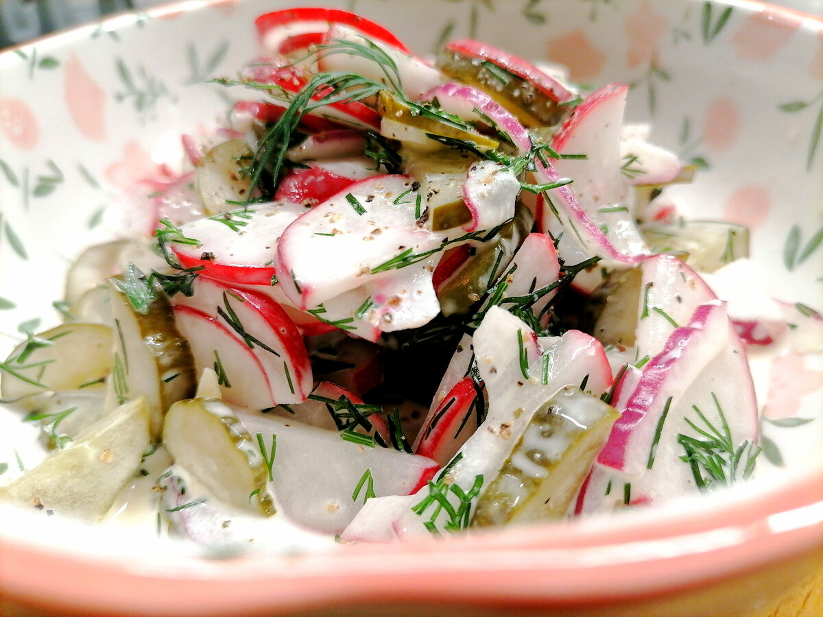 За пять минут можно приготовить очень вкусненький салатик. Он сочный и вмеру острый и отлично сочетается с жареным мясом. Нарезать тонкими полукольцами редис, маринованные огурчики, красный ялтинский лук примерно в одинаковом количестве. Заправить майонезом с одной чайной ложкой зерненой горчицы. Добавить любую зелень. Если салат немного постоит, то лук подмаринуется и будет ещё вкуснее. Если вам понравился рецепт, подписывайтесь на мой канал, будет вкусно 😉!