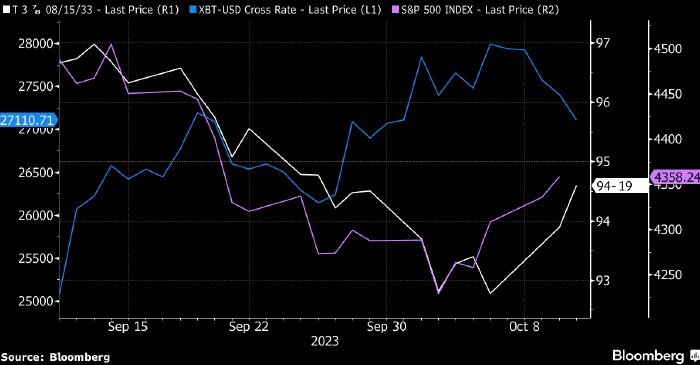 ⚡️ Биткоин может подорожать Во второй половине сентября доходность гособлигаций США заметно выросла, и на этом фоне биткоин показал гораздо более сильную динамику, чем S&P 500. Затем доходность трежерис начала снижаться, биткоин подешевел, а рынок акций США подрос. Аналитик Sanford C. Bernstein Гаутам Чугани предлагает следующее объяснение прямой корреляции биткоина с доходностью трежерис и обратной с S&P 500. По его мнению, биткоин может стать главным бенефициаром смягчения позиции ФРС. Рост доходности трежерис повышает риски новых проблем в банковском секторе США, которые вынудят ФРС смягчить денежно-кредитную политику, пишет эксперт. Поэтому биткоин, по его мнению, может подорожать в случае новой волны роста доходности трежерис.