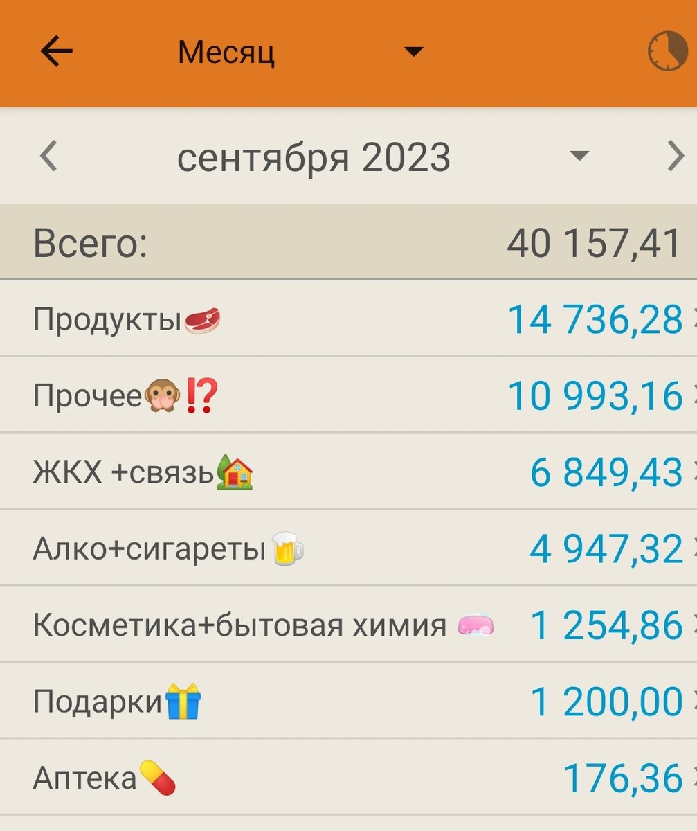 Сентябрь месяц наконец-то меня порадовал по расходам, было потрачено 40 157,41 руб. Удалось войти в лимит (про него я писала тут). 1. На продукты потрачено 14 736,28 руб. Хороший результат, влезла в выделенную сумму.Позже скину аналитику по продуктам. 2.Прочее - 10 993,16 руб. (поездка мужа, замена стелек, термометр и установка заказа). 3.ЖКХ и связь-6849,43 (в конце месяца пришлось положить ещё себе на телефон, а так сумма похожая из месяца в месяц) 4.Вредные привычки - 4947,32 (уже меньше, что радует) 5.Кометика и бытовая химия - 1254,86 (доместос, карандаш для бровей, порошок, гель для стирки, зубная паста, влажные салфетки, прокладки, крем, хна для бровей, отбеливатель, водооталкивающая Пропитка) 6.Подарки - 1200, 00 (родственнику) 7.Аптека 176 руб. Что-то по мелочи для посещения врача, расходники думаю. В принципе я очень довольна, а спонсор экономии-отъезд мужа😅 По доходам они превышают расходы, ура!) По покупкам на маркетинг плейсах: