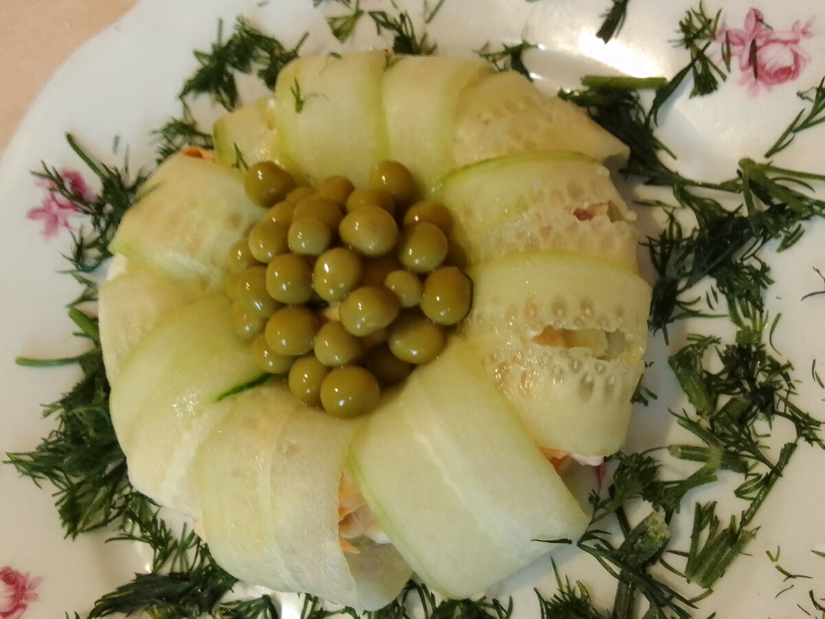 Итак, сегодня я Вам расскажу один рецепт салата, и способ его необычного оформления из свежего огурца. Для приготовления нам понадобится 1. Отварной картофель - 4 шт. 2. Яйцо- 4 шт. 3. Морковка по корейски- 100 гр. 4. Свежий огурец- 2 шт. 5. Маринованный лук - 1 шт. (Среднего размера) 6. Майонез- по вкусу 7. Отварная курица-200 гр. 8. Зелёный горошек- 4 ст. ложки 9. Маринованный лук 10. Укроп (для украшения) Способ приготовления Отварить картофель, яйца, курицу. Лук замариновать (мелко порезать, положить 1 ч. ложки соли, 2 ч. ложки сахара, 1 ч. ложку уксусной эссенции 70 %, залить 200 гр. кипятка оставить на 15-20 мин. для того, чтобы лук замариновался) Картофель, яйца, курицу, 1 огурец порезать мелкими кубиками и смешать со всеми ингредиентами. Затем заправить салат майонез. Овощечисткой порезать вдоль второй огурец, салат выложить по кругу блюда в середину положить салат сформировав из него кольцо. Каждую пластинку порезанного огурца аккуратно заправить в середину кольца. Для