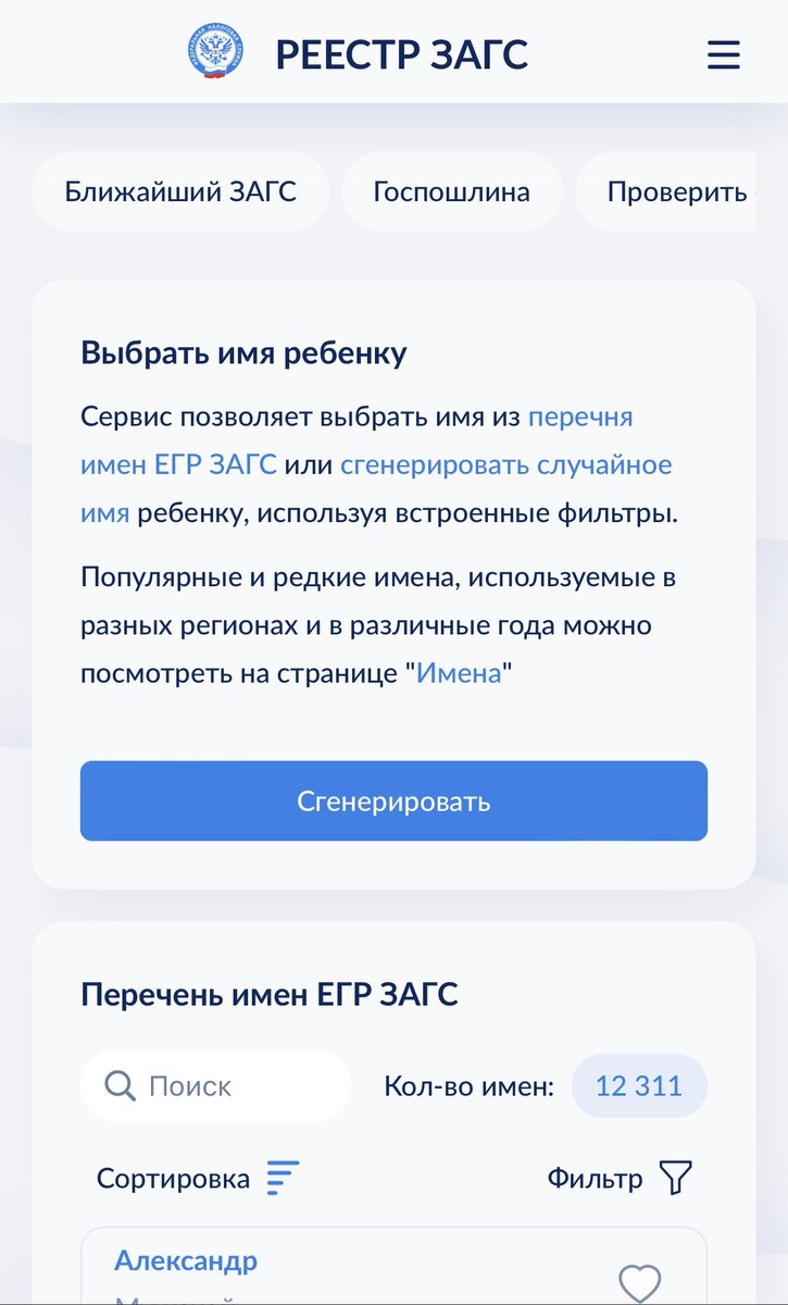 Заходим на официальный сайт и находим реестр загс. Можно просто нажать вот сюда 👈 Сверху представлен сам генератор, а ниже можно посмотреть перечень популярных и редких имен.