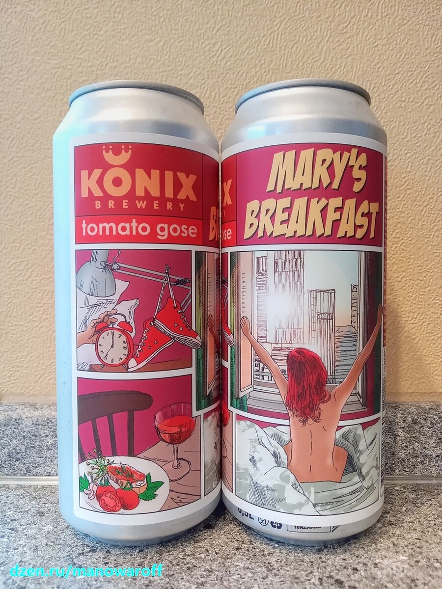 Как вы, наверное, догадались, сегодня у нас пивоварня Konix Brewery с очередной томаткой из линейки про Машу. А называется это пиво Mary’s Breakfast. Честно говоря, я думал, что это новинка. Но оказалось, что данное пиво является вторым по счету в линейке и появилось еще в сентябре 2019 года. Просто мне оно до сих пор не попадалось. К моменту вскрытия моей банке пива было немногим меньше трех месяцев от роду. Срок годности составляет восемь месяцев при комнатной температуре. Почитаем описание: Закисленное по технологии sour kettle, нежный аромат томатов поддержаны целым набором специй: перец, чеснок, лист чёрной смородины и гвоздика, придающими островатое, пряное послевкусие, а утонченная солоноватость достигнута добавлением розовой гималайской соли. Что интересно, на банке состав совсем другой: Как видите, никакого чеснока, черносмородинового листа, гвоздики и гималайской соли. Что-то тамошние маркетологи напутали. ТТХ: Алкоголь - 4.8% Плотность - 12% Горечь - 8 Хмель - ??? Пиво жиде
