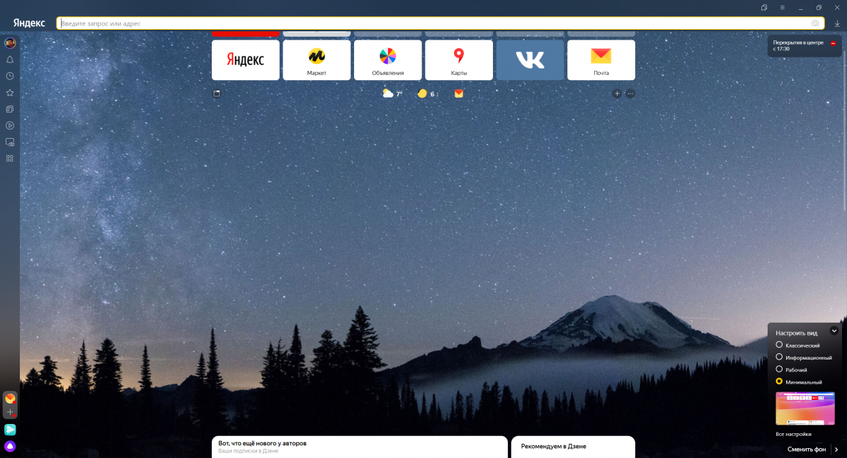 По умолчанию и в мобильной и в настольной версии браузера "Атом" отображается лента статей "Пульс". Однако можно скрыть все лишние элементы и настроить приложение по своему усмотрению, включая режим "Minimal", в котором отображается только поисковая строка.