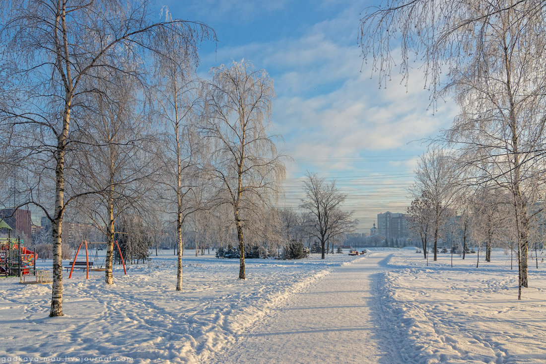[13.02.2021] Напротив парка Малиновка, через проспект Передовиков находится ещё один парк - Ладожский. Два года назад его благоустроили: расчистили, проложили дорожки, поставили детские и спортивные площадки, высадили новые деревья и цветы. Последний раз я тут проходила лет 12-13 назад, когда мы ещё жили в доме напротив Малиновки и регулярно ходили за покупками в Метро. Тогда это был просто дикий, заросший бурьяном кусок между Метро и лэп. Теперь вот - приятное для прогулок место. Берёзовая рощица. За ней - проспект Косыгина. Участок между обустроенной частью парка и Охтой. Сделали тут тоже что-нибудь или нет - под снегом не видно. Вид на восток, в сторону пр. Передовиков и Малиновки. В другую сторону, на запад. На дальнем плане - ЖК "Зима-Лето" на пр. Энергетиков. Саму набережную Охты тоже благоустроили: появились дорожка, скамейки, шезлонги, детские площадки и прочие парковые штуковины. Дорожка вдоль Охты. На заднем фоне - синий сарай Метро. Заканчивается набережная на задворках дома