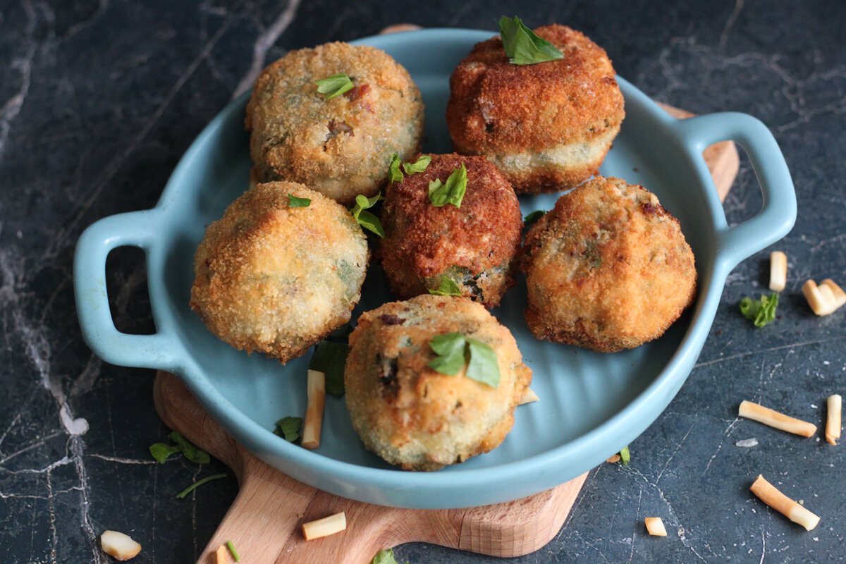 Яйца - 2 шт. Куриное филе мелко нарезать, сын натереть на терке или также мелко нарезать. Зелень мелко порубить ножом. Грибы и лук мелко нарезать и обжарить на сковороде на растительном масле. В миске соединить курицу, сыр, зелень, грибы с луком яйцо и сметану. Хорошо перемешать. Их получившейся массы сформировать небольшие шарики весом примерно 50-55 г. Выложить их на доску или коврик и убрать в холодильник на 30 минут. Для панировки приготовить 3 миски: с сухарями, мукой и взбитыми яйцами.