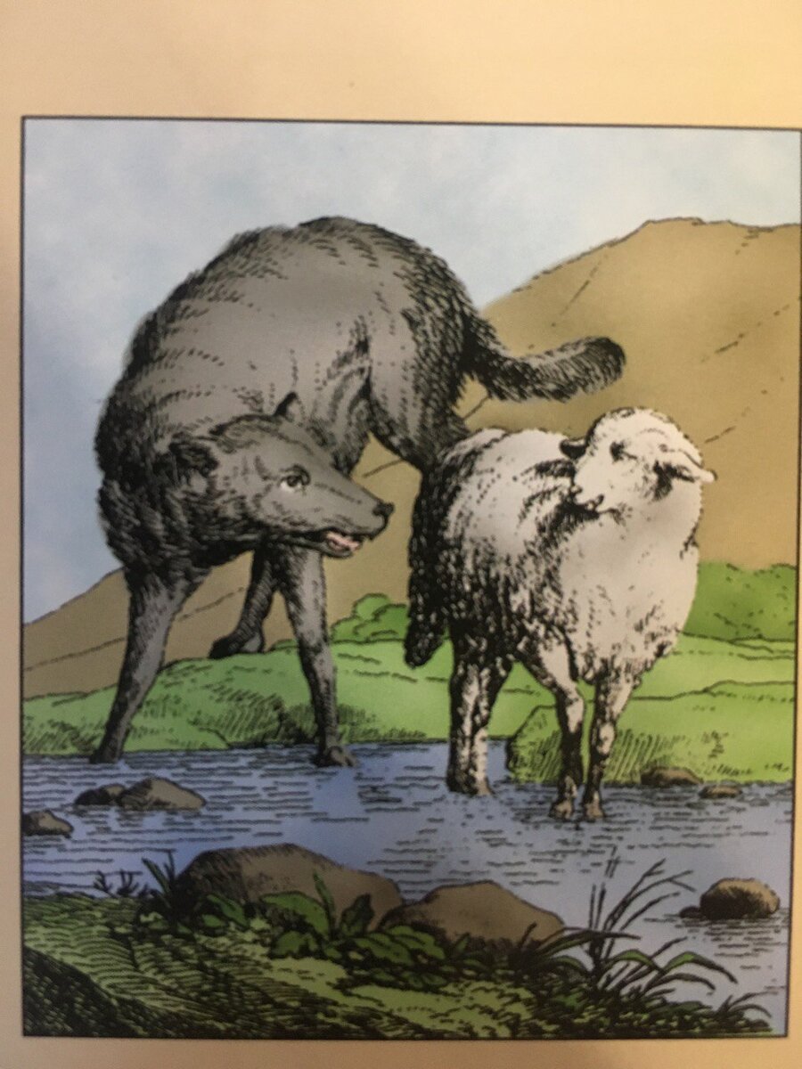 Ягненок без присмотра пастуха и сторожевого пса является вполне законной добычей Волка. День выдался жарким, пастух и собаки задремали, и маленький Ягненок ...зашел к ручью напиться;