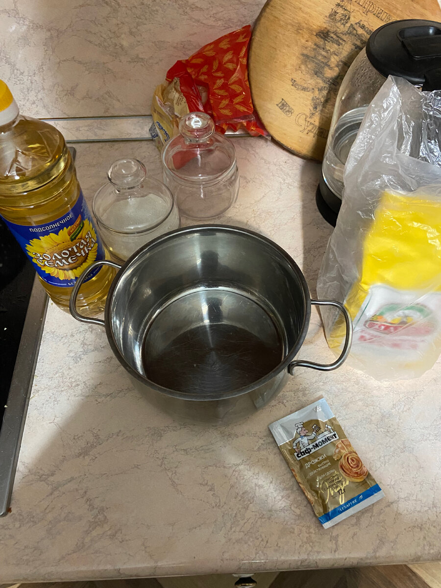 Повара в школьной столовой не успевали печь эти пиццы, так как их мигом раскупали. Недавно спросил мою бабушку «в чем же был секрет этой пиццы?». Она ответила, что этот секрет в простоте и свежести изделий! И потом рассказала мне по порядку как эту пиццу готовить. Для начала тесто. Самая сложная часть для меня😅. Нужны теплая вода, дрожжи, соль, растительное масло и мука. Сначала в теплой воде хорошо размешиваем дрожжи, соль, масло. До единой консистенции. Далее всыпаем муку, пока тесто не станет прилипать. И мешаем долго, а главное руками! Затем необходимо дать нашей будущей основе пиццы отдохнуть буквально на час-полтора. За это время наше тесто поднимется и можно начинать формировать пиццу. Я не стал делить на маленькие кусочки, сделал большую. Оставшееся тесто завернул в пакет и положил в духовку. Для начинки взял сыр, у меня ветчина индейки (почти аналог докторской колбасы), кетчуп и маринованные огурчики. Ветчину и огурчики режим кубиками, сыр на терке. И формируем круг из т