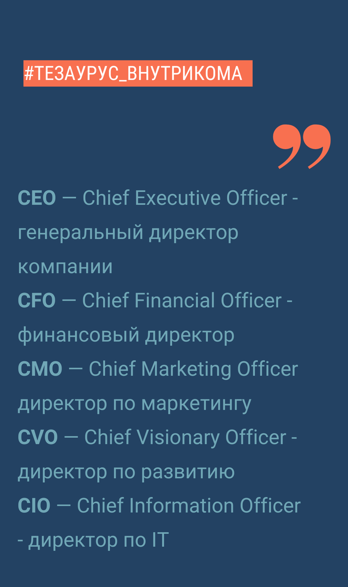 В последние годы руководящие должности на российском рынке труда часто называют аббревиатурами: CEO, CFO, CVO, CMO и другими. Большинство из вас наверняка встречали название должности CEO — генерального директора.