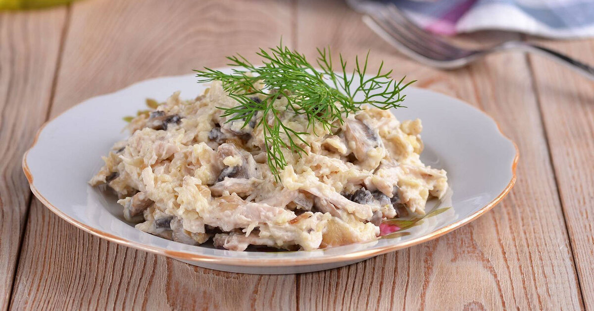 Ингредиенты: Болгарский перец-1шт., сыр-150гр., консервированные грибы-400гр., куриная грудка-1шт., соль, перец-по вкусу., сметана для заправки. Приготовление: Перец порезать тонкими ломтиками. Грибы порезать тонкими полосками. Куриную грудку отварить. Мелко порезать. Сыр натереть на тёрке. Все ингредиенты смешать. Заправить сметаной. Посолить, поперчить. Приятного аппетита!