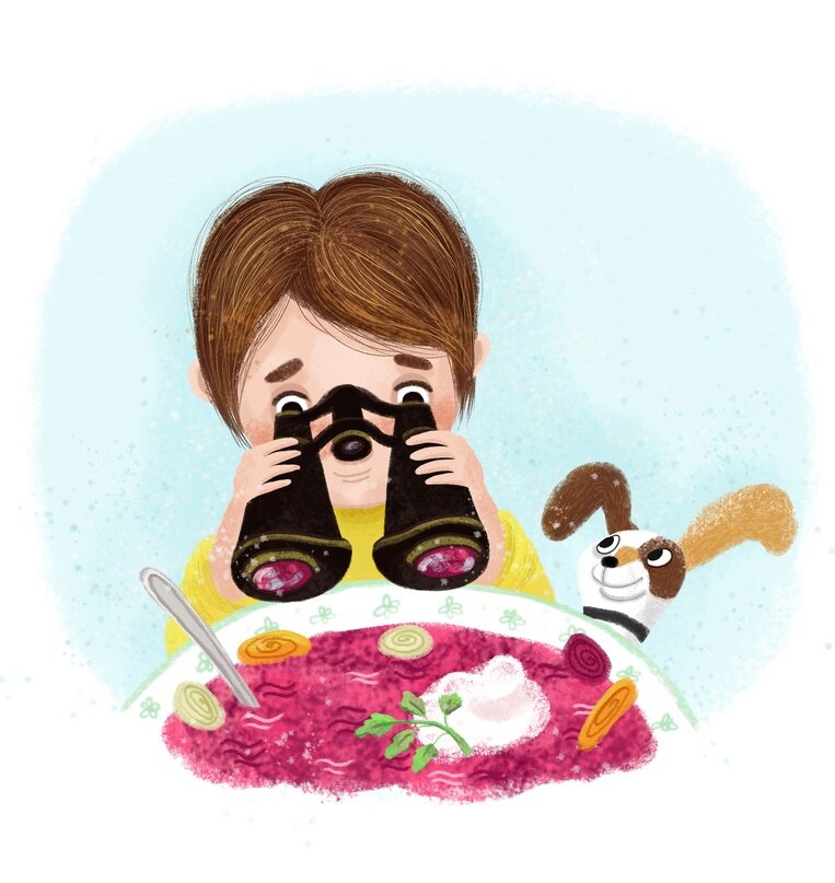 Сегодня на обед мама приготовила борщ. Матвей сидел за столом и вылавливал кусочки лука и свёклы, раскладывая их по краю тарелки. Пес Волчок с аппетитом хрустел косточкой возле своей миски. - Везёт тебе, борщ есть не заставляют, - позавидовал питомцу Матвей. - Мама говорит, что овощи полезные. А я вот считаю, что они вредные и невкусные. С улицы донеслись радостные детские голоса. Матвей с тоской посмотрел в окно и нехотя пододвинул к себе тарелку, но так и не притронулся к обеду. Как же он не любил свекольно-капустный запах! Тут мальчик вспомнил про бинокль, который видел утром в дедушкиной комнате. Интересно, что будет, если посмотреть на борщ через увеличительные линзы? Матвей тихо выскользнул из-за стола и прокрался в соседнюю комнату. На стене висела рамочка с дедушкиной фотографией. В белой капитанской фуражке он стоял на палубе корабля и всматривался в морскую даль. На столе под фотографией лежал блестящий чёрный бинокль. Матвей бережно взял его, вернулся к столу и с любопытство