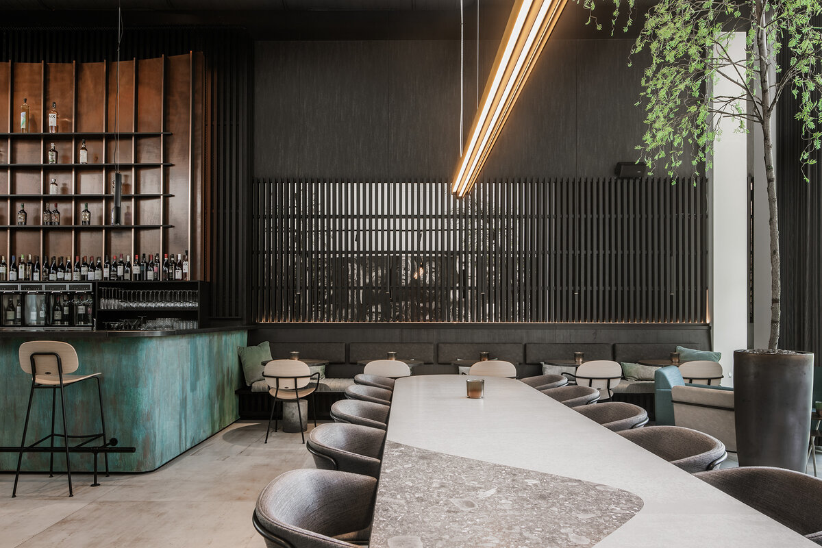 Когда Creneau International начинает разработку концепции дизайн-проекта интерьера, часто именно дизайнер интерьера начинает собирать настроения, подбирать материалы и оформлять интерьер. Это только позже, в процессе, уже графический дизайнер создаёт общую картину. Но не с отелем Beila. В этом случае, концепция дизайна опирается на графические линии. Итак, прежде всего: логотип. Дизайнеры начали с герба Билзена 1819 года. Они черпали вдохновение из взаимодействия геометрических линий и кривых дерева. Цветовая палитра была основана на гербе. В зависимости от типа коммуникации, логотип появляется в разных формах и цветах. Дизайнеры экспериментировали с акварельными чернилами для создания градиентов и «пятен». Они стали частью фирменного стиля, включая бейджи, меню и канцелярские принадлежности и даже, сделав шаг вперед, в фартуках сотрудников