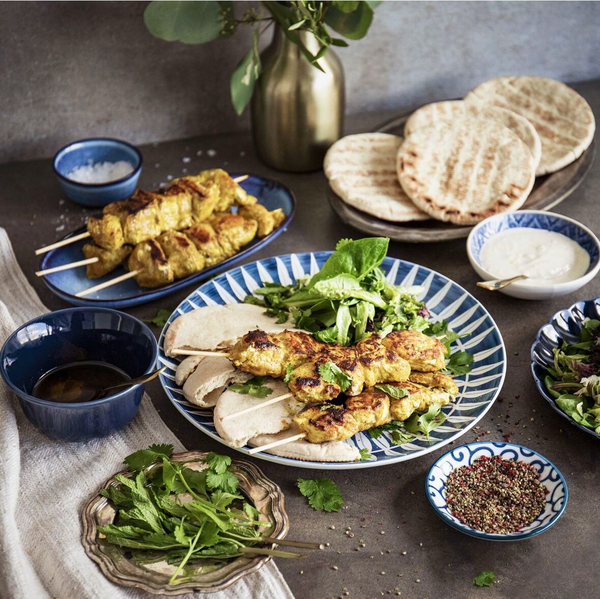 - Подавайте ароматные куриные шашлычки на лепешке, с салатом и соусом, а также украсьте наше блюдо ароматной свежей кинзой и мятой. Не забудьте добавить йогуртовый соус для дополнительного вкуса.