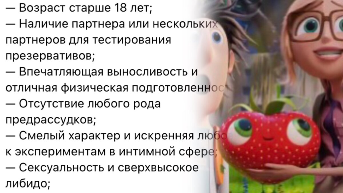 Дел так много, что некогда заглянуть на свой канал. Но тут встретилась вакансия, подумал, что если у кого-то дел не очень много, то может заинтересуются. Там нужно тестировать презервативы. Требования скопировал. Читайте, прикидывайте, подходите ли для такой ответственной работы. Если на этом этапе вы подходите, то все ещё не расслабляйтесь, потому что это ещё не все требования. Думаю, тут главное - английский 😳😳😳 Не стесняйтесь, подавайте свою кандидатуру, чтобы помочь миллионам людей улучшить их жизнь (не всю, но интимную). Теперь самое интересное - обязанности. 3 комплекта по 12 штук инновационных презерватива. Нужно оценить удобство, и по специальному шаблону - ощущения… (интересно, что за шаблон) А потом ещё с командой поработать и поделиться впечатлениями))) Очень интересная вакансия. А условия - привлекательнее некуда. Есть ноутбук и партнёр - уже полдела. 100 евро за каждое протестированное резиновое изделие. А для тех, кто любит славу - шанс стать выдающимся примером. Сроч
