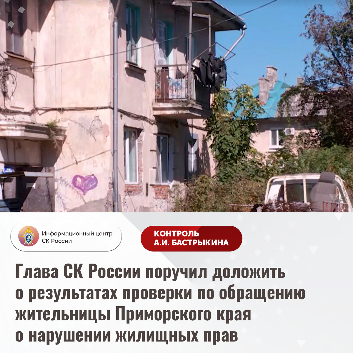 К Председателю СК России А.И. Бастрыкину в его Приемную «ВКонтакте» обратилась жительница города Уссурийска Приморского края. Она выразила несогласие с действиями местной администрации при расселении аварийных многоквартирных домов. Женщина проживает в здании, 1950-х годов постройки, кирпичная кладка фундамента которого разрушается, в стенах имеются трещины. За предоставление благоустроенного жилья с нее требуют значительную дополнительную плату. Обращения в уполномоченные органы результатов не принесли, нарушенные права женщины не восстановлены.