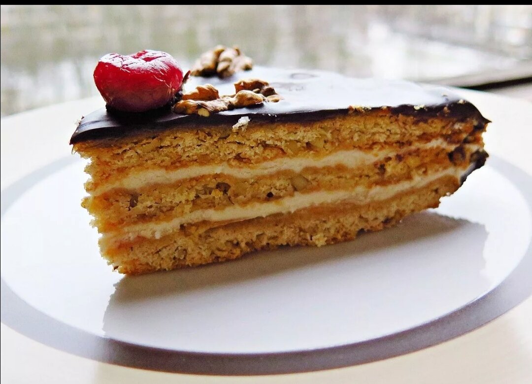 Нам понадобится: ДЛЯ ТЕСТА НУЖНО: 2,5 стакана муки 100 гр сливочного масла 1 яйцо 1 стакан сахара 100 гр меда 2 ст л сметаны 1/2 ч л соды гашёной уксусом ДЛЯ КРЕМА ПОНАДОБИТСЯ: 1 стакан густой охлаждённой сметаны 1 стакан сахара 20 шт толченых грецких орехов ДЛЯ ГЛАЗУРИ ПОНАДОБИТСЯ: 0,5 стакана сахара 3 ч л какао 5 ст л молока 1 ст л сливочного масла 1. Замешиваем негустое тесто и делим на три части, из которых выпекаем 3 коржа. НЕ ЗАБУДЬТЕ : КОРЖИ ВЫНИМАЮТ ИЗ ПРОТИВНЯ , КОТОРЫЙ ПЕРЕД ВЫПЕЧКОЙ СМАЗАН МАСЛОМ, В ХОЛОДНОМ ВИДЕ. 2. Нижние два коржа нужно смазать кремом, а верхний покрыть глазурью. Крем готовится так - сметану взбиваем с сахаром, и добавляем орехи. 3. Для глазури - сахар смешивают с какао , в смесь добавляем молоко и все варим на маленьком огне до загустения. Горячей глазурью , в которую добавлено масло, и заливается торт ! ПРИЯТНОГО ВАМ АППЕТИТА 😋!!!!