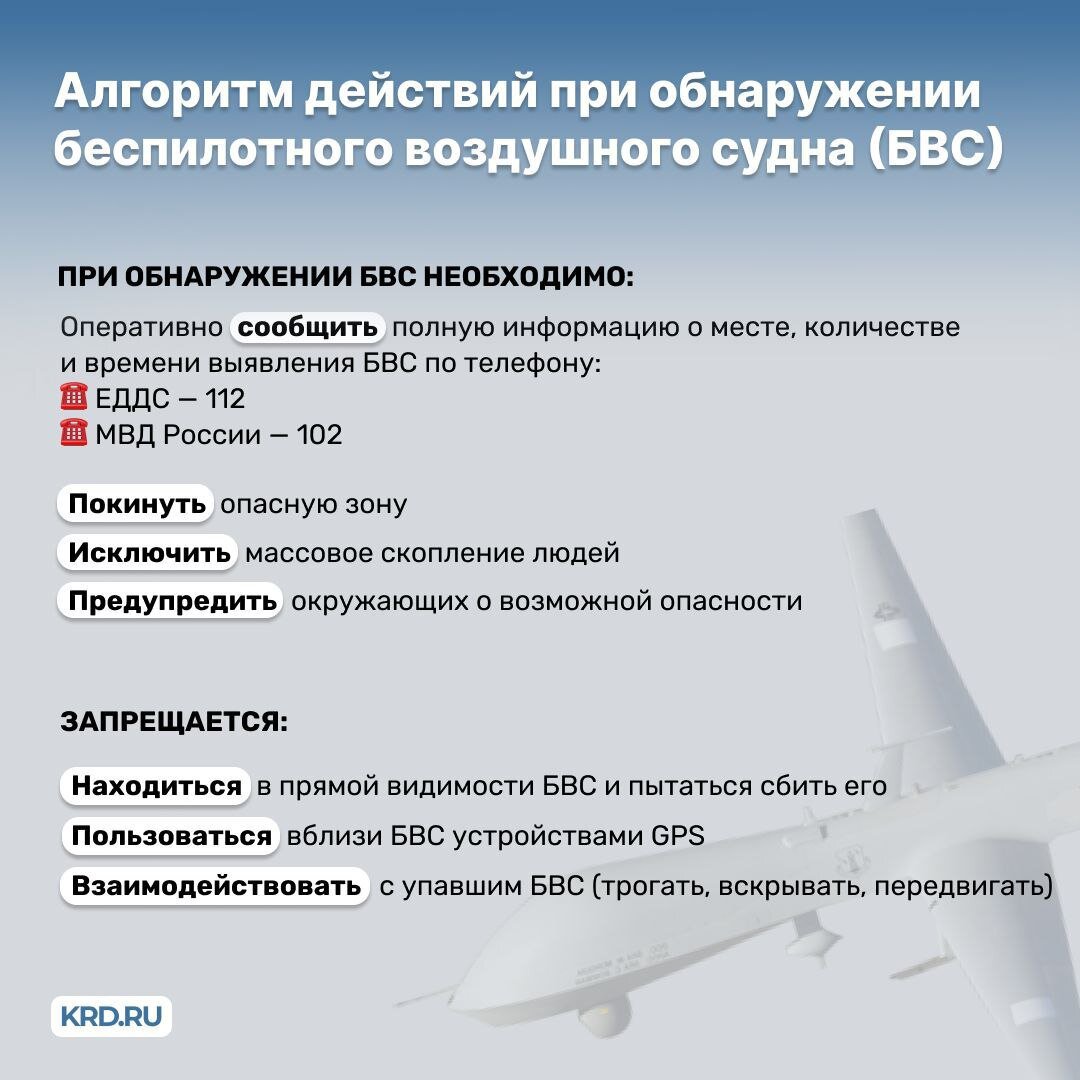 Администрация Краснодара 15 октября предупредила население города о правилах поведения при появлении беспилотных летательных объектов. В социальных сетях администрации Краснодара после вчерашней атаки дронов ВСУ по Адлеру вновь разместила алгоритм действий для жителей, которые увидят в небе дрон. Краснодарцам при виде дронов советуют покинуть опасную зону. Что она собой представляет не указывается, но, как рекомендовал во время визита в Краснодарский край основатель ЧВК «Вагнер» Евгений Пригожин, следует прятаться от поля видимости БПЛА, например, встать под дерево и бежать в укрытие. Сразу же следует отключить при наличии устройства GPS. Фото: администрация Краснодара Также в мэрии рекомендуют при подлёте беспилотника покидать массовые скопления людей, в случае, если краснодарцы оказались в таких местах, на ходу информируя других граждан об опасности и необходимости укрыться. При первой возможности следует звонить в полицию (номер телефона 102) и Единую дежурную диспетчерскую службу (