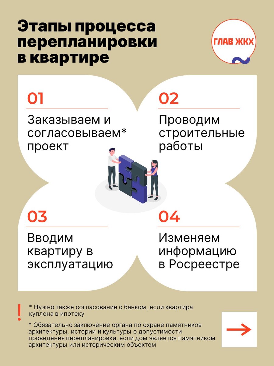 Сделали на удобных карточках напоминалку о том, как согласовывается перепланировка помещений в многоквартирных домах. Текстовый вариант напоминалки - на сайте ГЛАВЖКХ.РФ